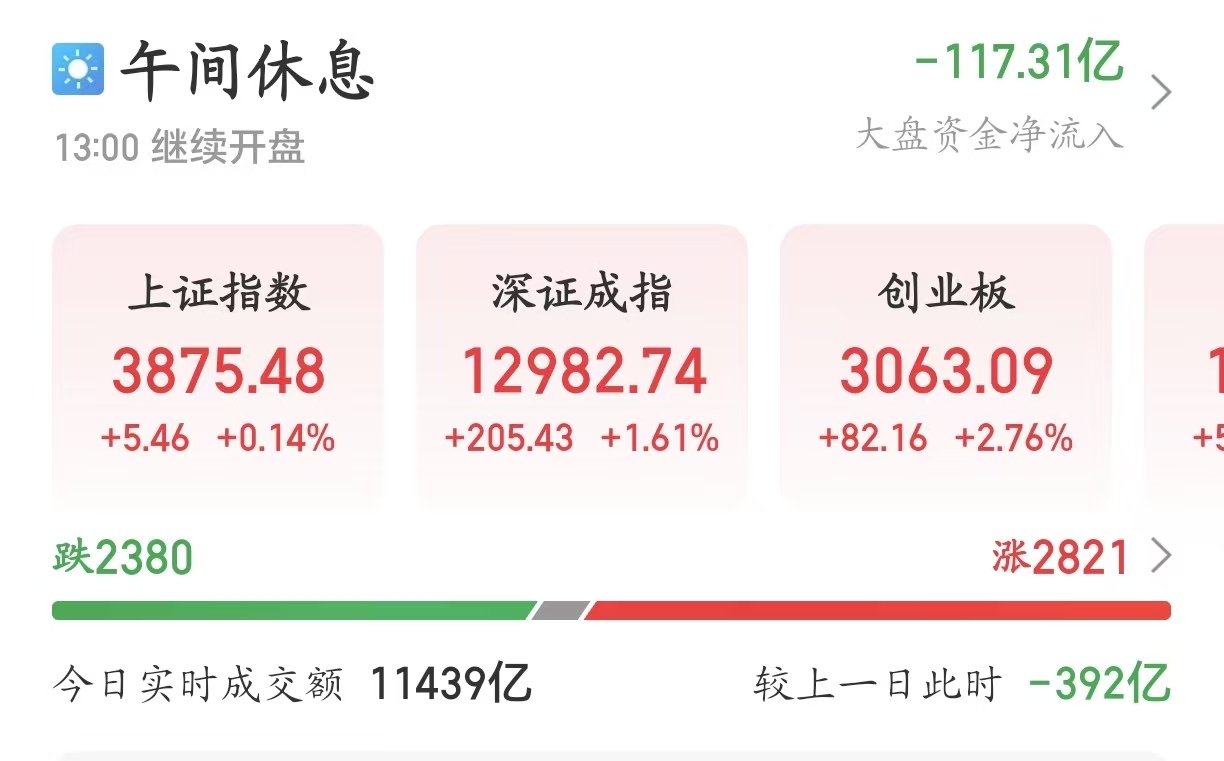 京沪深三市2380只个股下跌,2821只个股上涨。